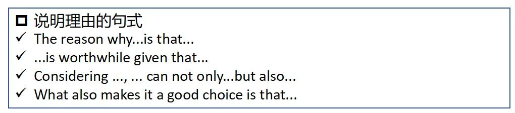 梳理信息之后我通常就会让孩子们练习句式的使用了,把常用来说明理由的句式再次复习一下(