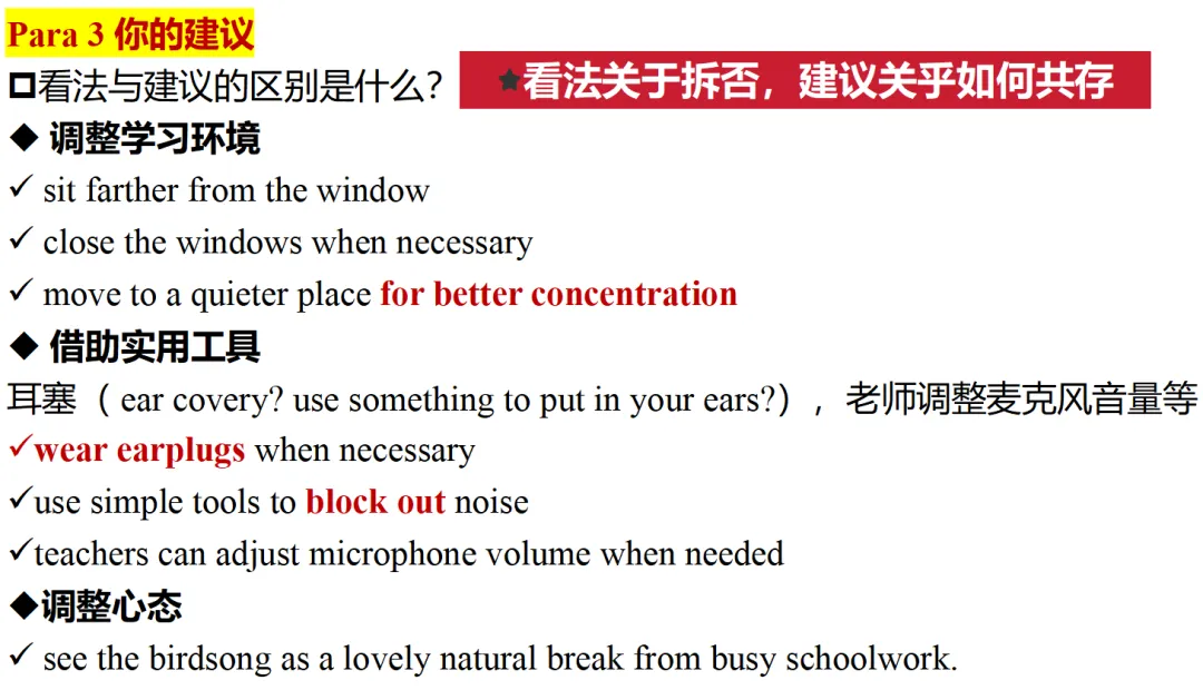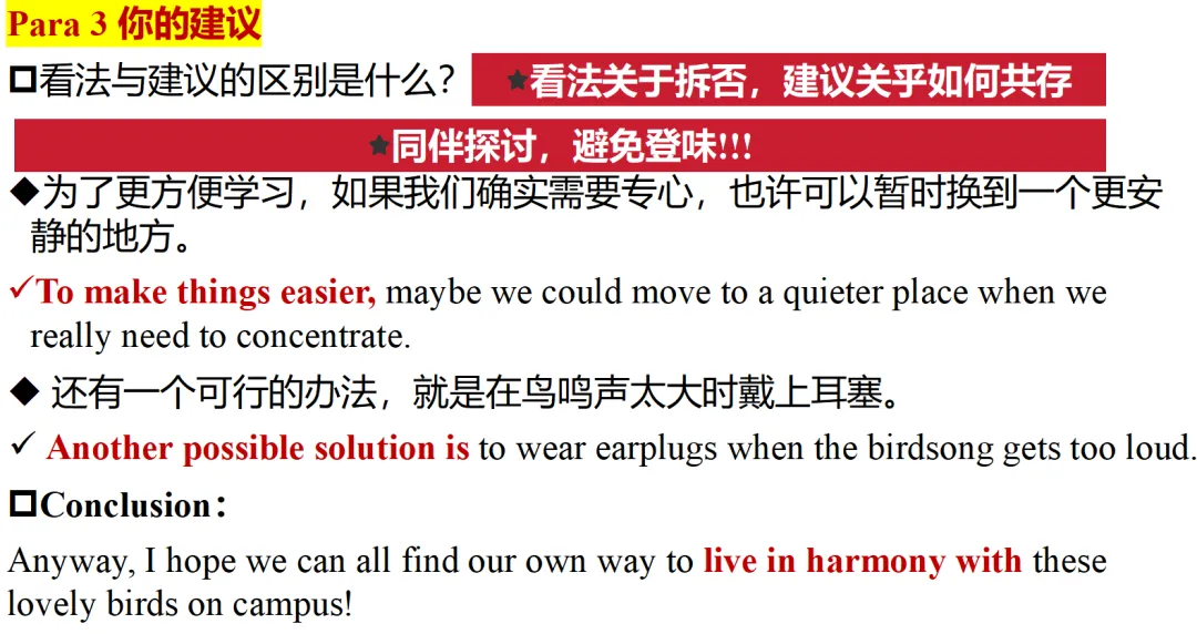 那么建议方面的内容也帮学生梳理一下,从内容和语言方面做一些积累