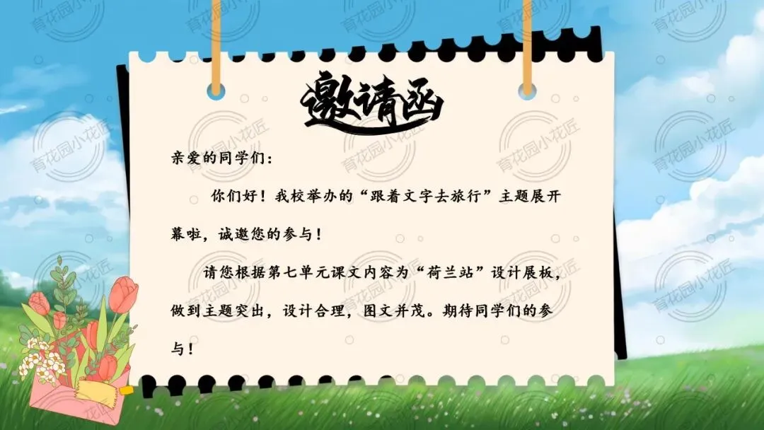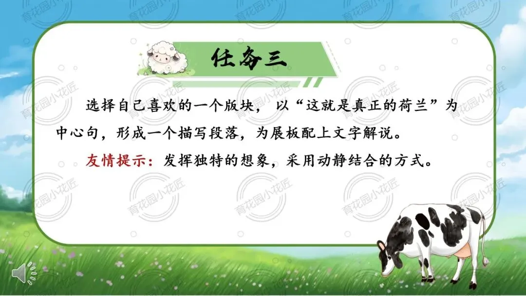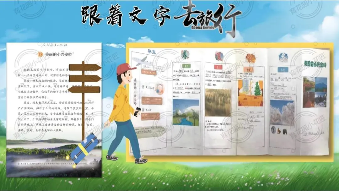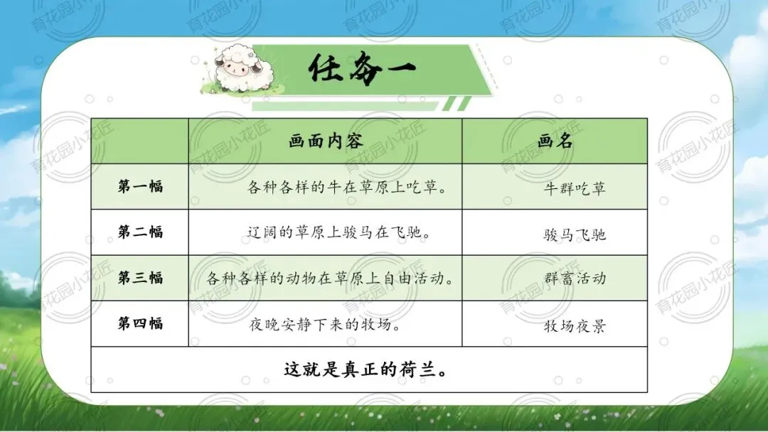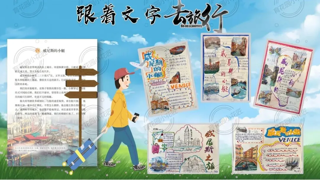 课堂以“跟着文字去旅行” 为沉浸式情境,锚定 “荷兰站展板设计” 总任务,拆解出 “画面命名、文本探秘、解说创作” 三个梯度子任务,完整落地 “文学阅读与创意表达” 学习任务群,让学生在真实任务中完成读、品、写的能力进阶。