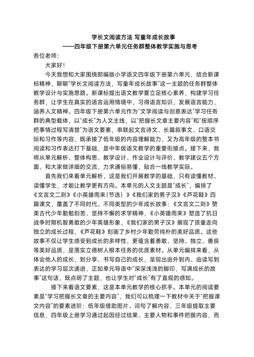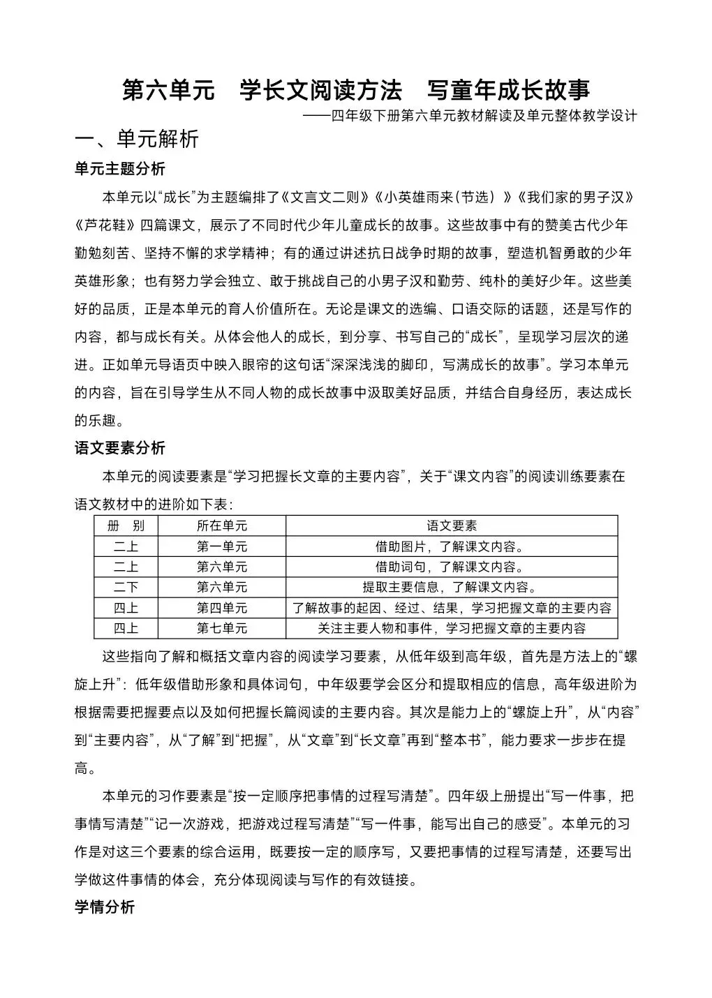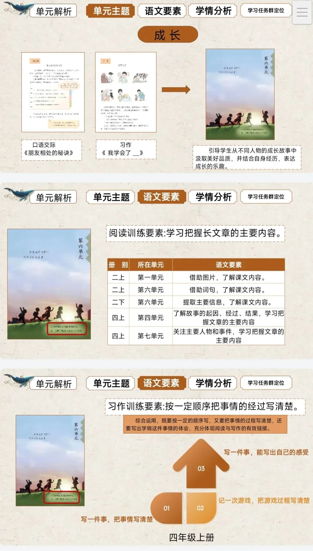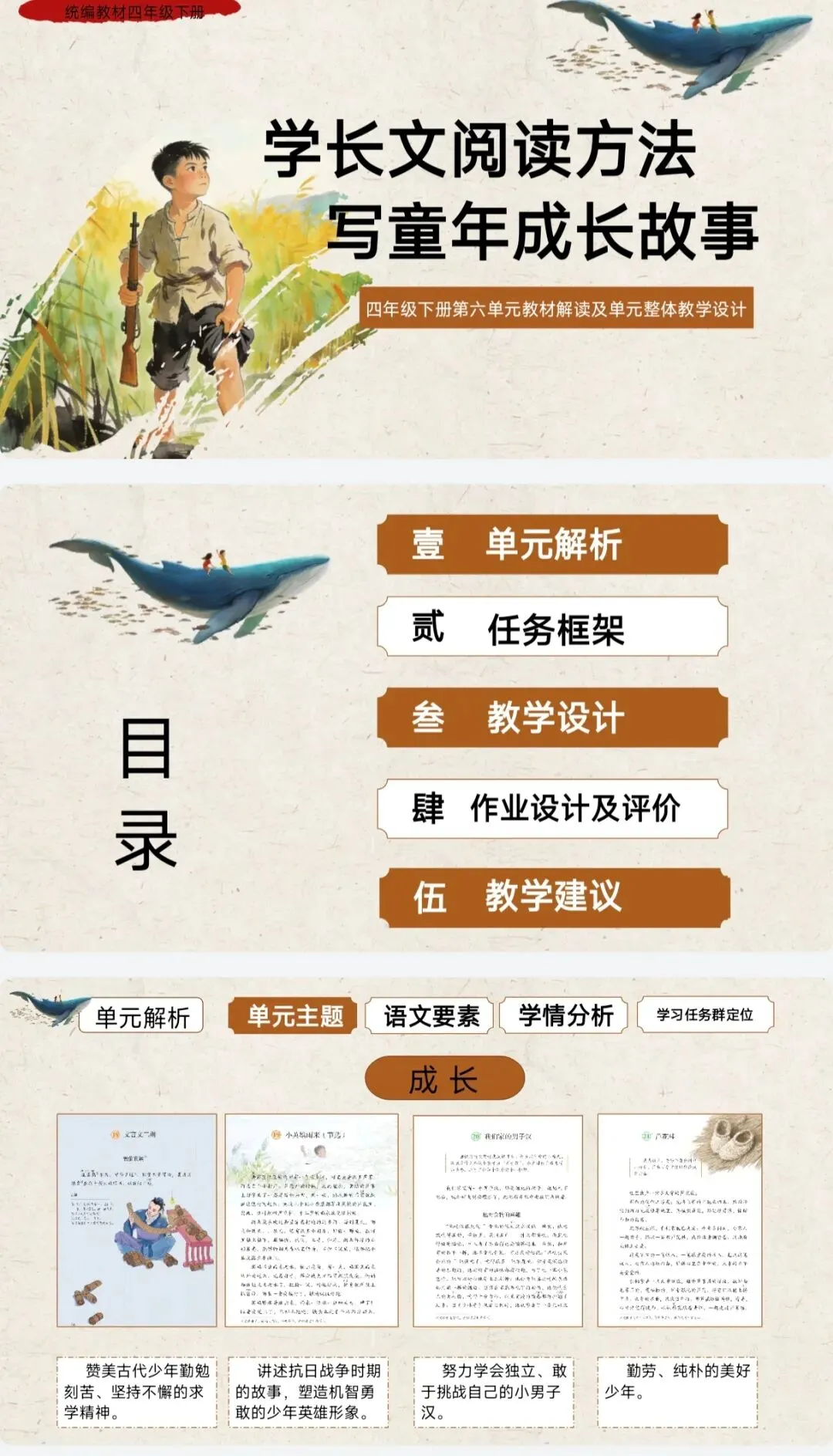 >[单元解读]四年级下册第6单元教材解读课件+整体教学设计+发言稿.