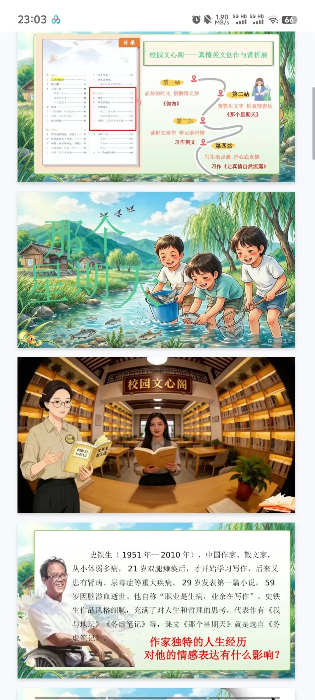 师:太默契啦!学校校园文心阁面向六年级同学征集“真情美文”,并举办线下赏析展,要求同学们先成为“美文赏析师”,品读名家经典散文、优秀习作例文,解锁“真情表达”的写作技法;再化身“真情创作者”,运用习得技法创作原创美文,参与征集与展览,最终评选出“文心小作家”。