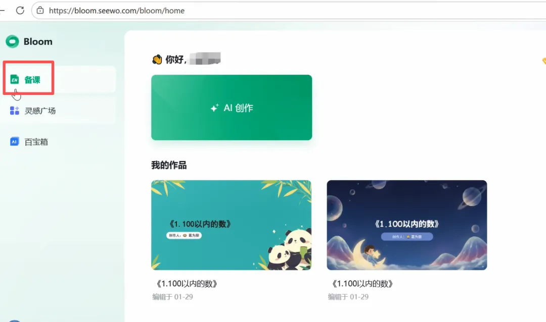 1、打开希沃AI备课网址:https://bloom.seewo.com,点击左侧的备课功能,进入AI创作备课。
