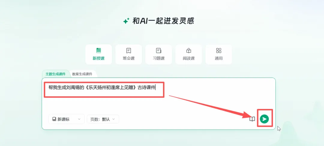 2、在对话框输入要生成的课件主题,例如我们要生成一个:初中语文刘禹锡的《乐天扬州初逢席上见赠》古诗课件,点击发送。