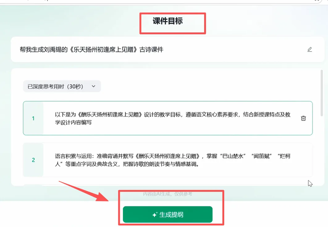 3、它会首先生成课件目标,然后我们点击下方生成提纲。