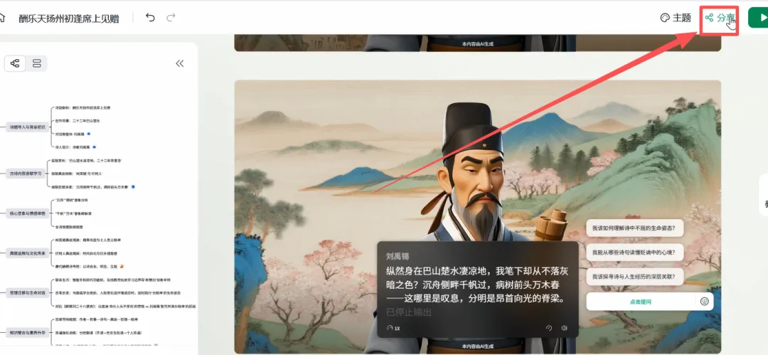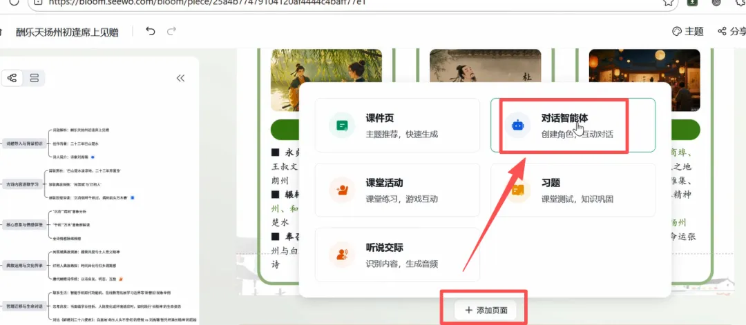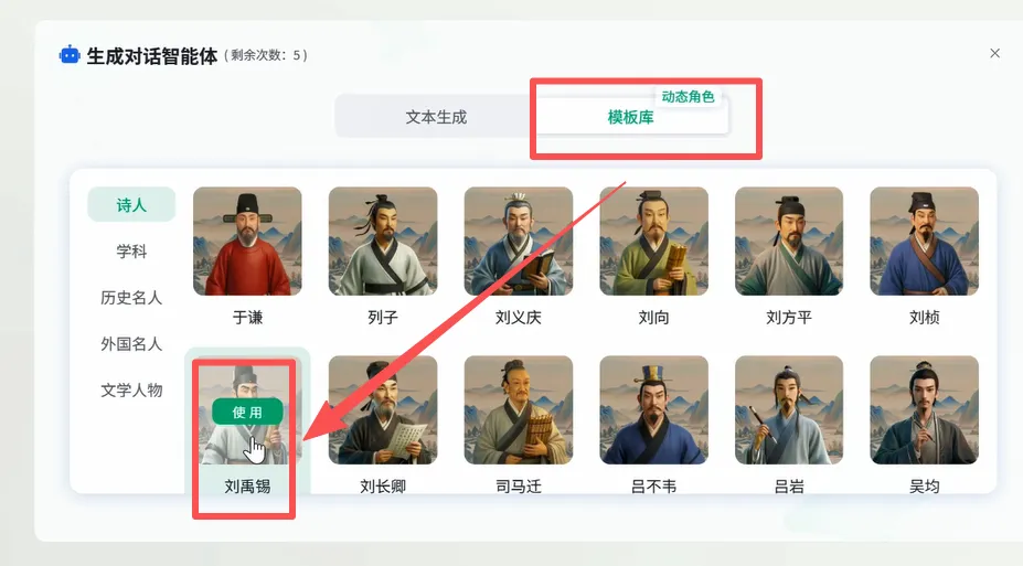 10、根据课文主题我们选择诗人,从模板库找到刘禹锡智能体点击使用即可插到课件中。