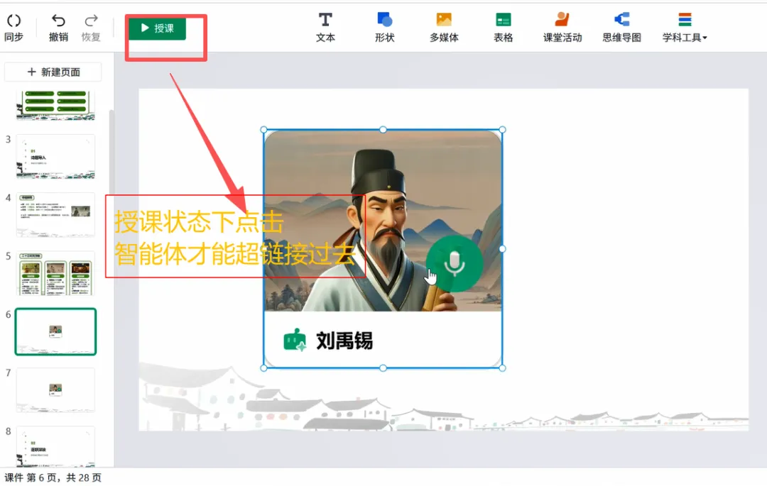 13,打开希沃课件使用智能体的时候,大家一定要注意在授课界面,这样点击智能体网页才能超链接过去。