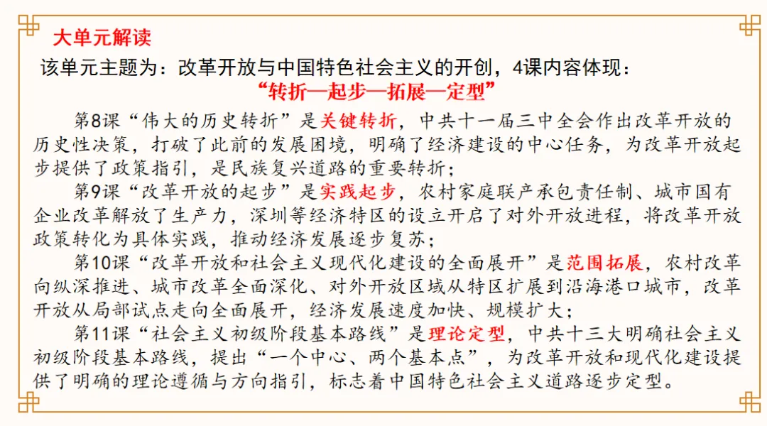 本课是第三单元“改革开放与中国特色社会主义的开创”开篇课,上承“文化大革命”的曲折教训,下启改革开放与现代化建设新局面。教材与课件完全对应,分为三大板块: