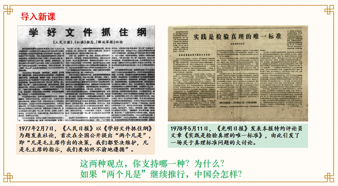 这两种观点你支持哪一种?为什么?如果“两个凡是”继续推行,中国会怎样?