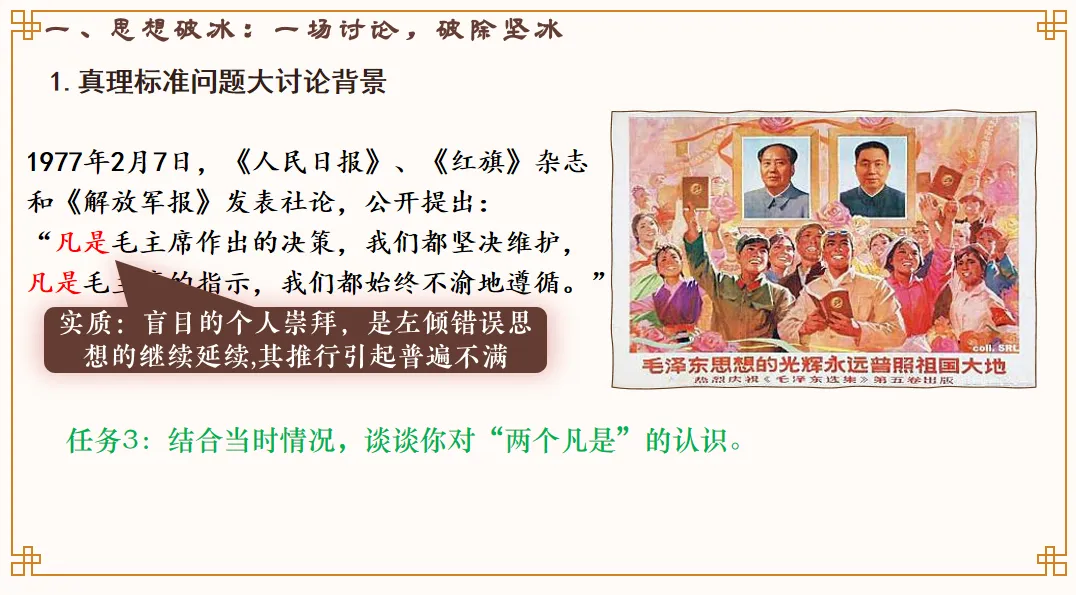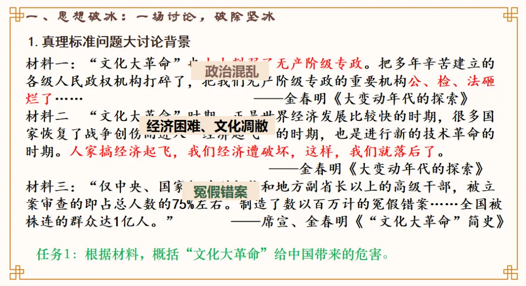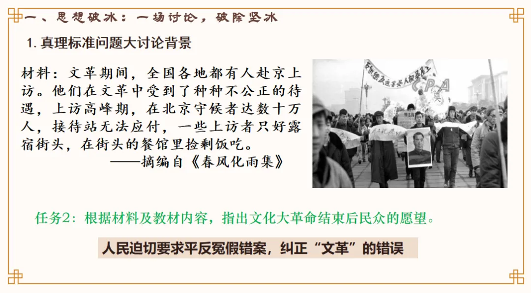 八年级学生已了解“文化大革命”基本史实,对历史转折有直观兴趣,但存在认知薄弱点:不理解真理标准大讨论为何是思想解放运动;难以把握“两个凡是”与实事求是的本质对立;对“伟大转折”的多重内涵理解浅显。本课依托课件图片、史料片段、任务驱动降低理解难度,强化历史逻辑。