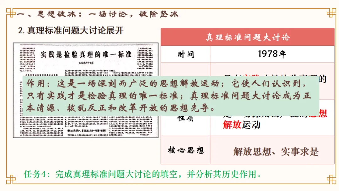 核心任务:完成真理标准讨论探究,理解思想解放是转折先导