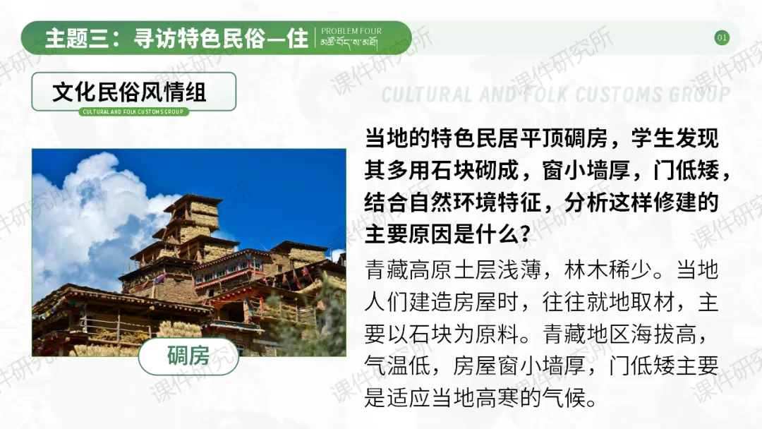 今天分享的是第41期磨课课件《青藏地区的自然特征与农业》,课件以川藏铁路为切入点,探究青藏高寒的自然特征,再延伸至高原农业和民俗,分析自然环境对生产生活的影响。设计自主、合作探究活动,搭配习题巩固,兼顾知识传授与能力培养,渗透人地协调观和爱国情怀。
