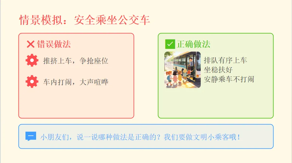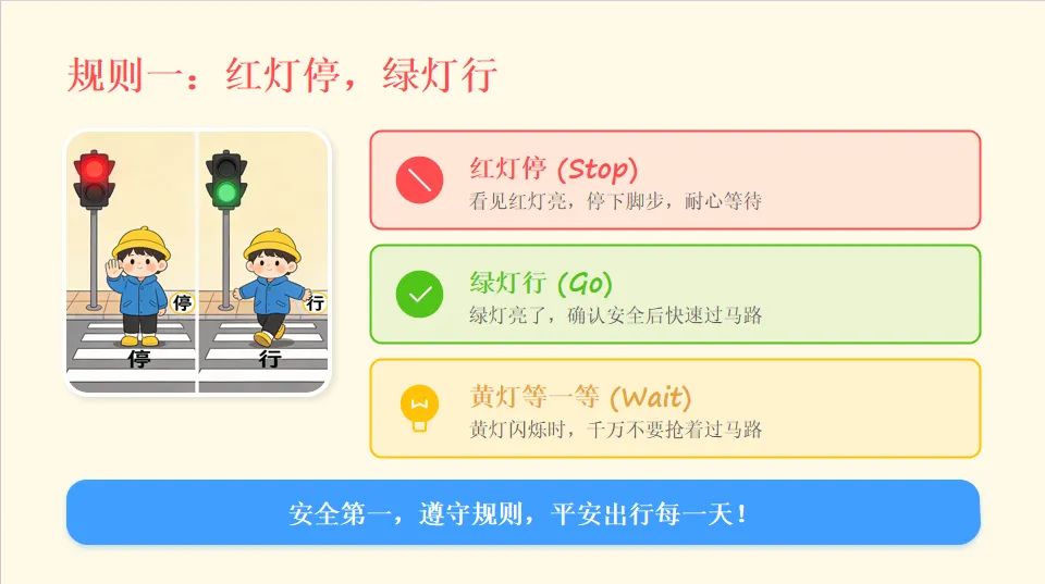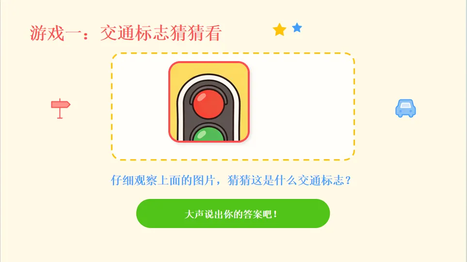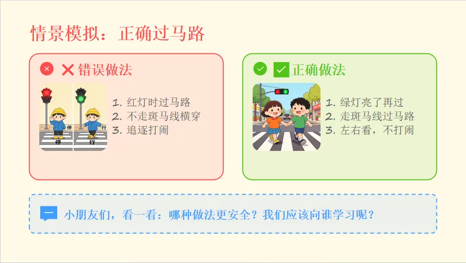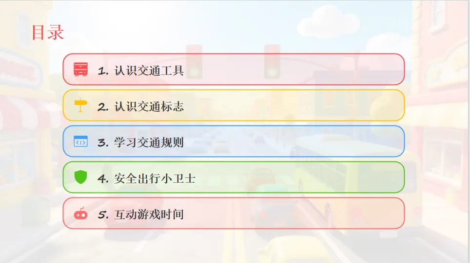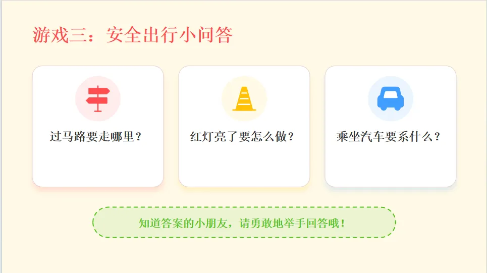 - 引出主题:马路上有很多车辆和规则,今天我们一起学习交通安全知识,做安全小卫士。