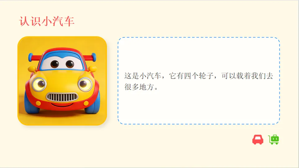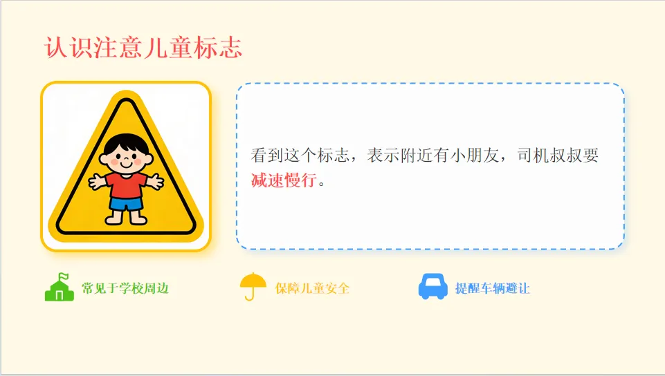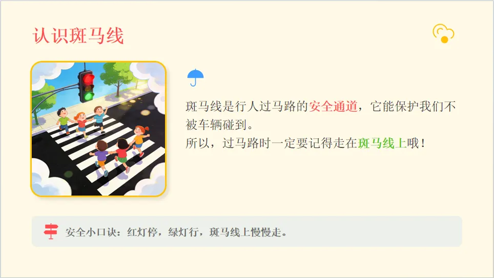 - 认知目标:认识常见交通工具、红绿灯、斑马线、注意儿童等交通标志,知道基本交通规则。