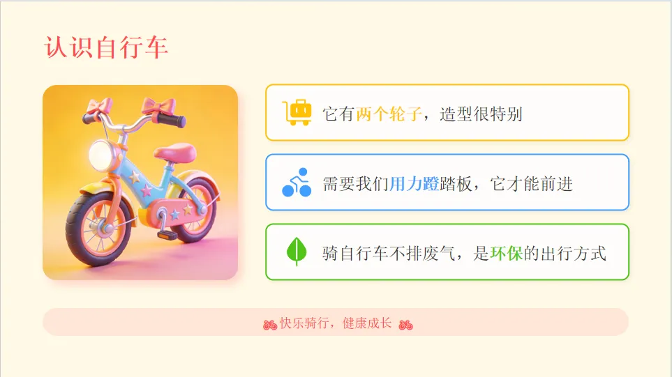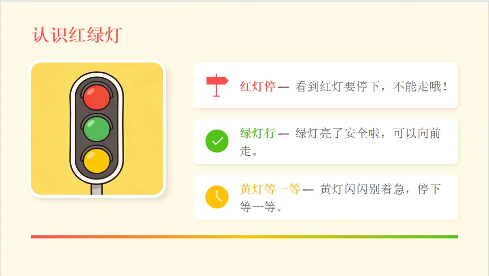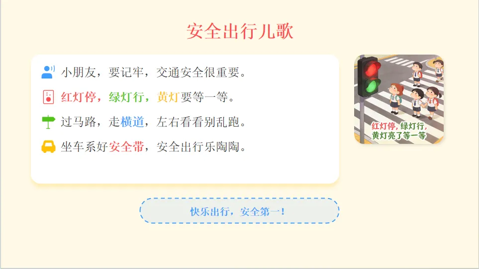 - 情感目标:树立交通安全意识,愿意做遵守交通规则的小朋友,养成文明出行习惯。