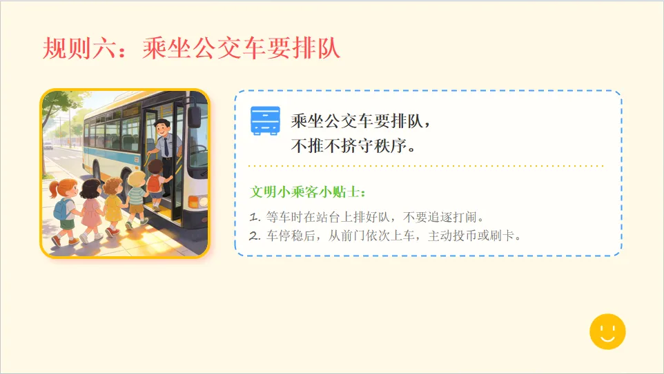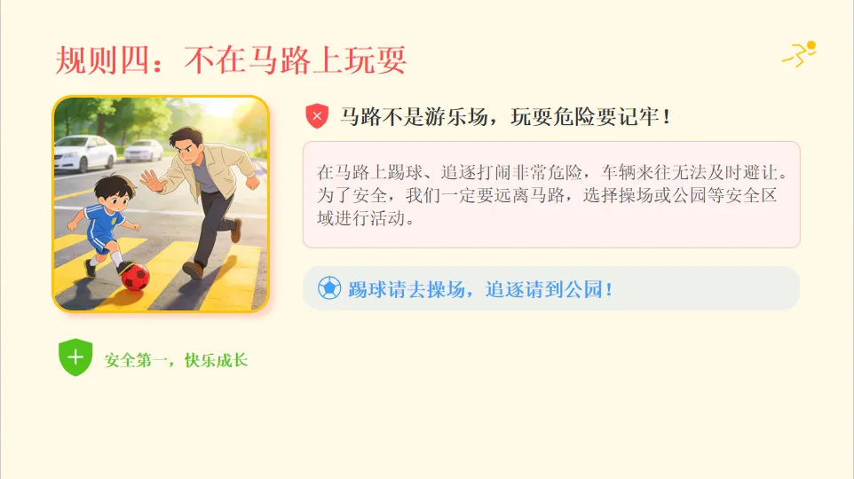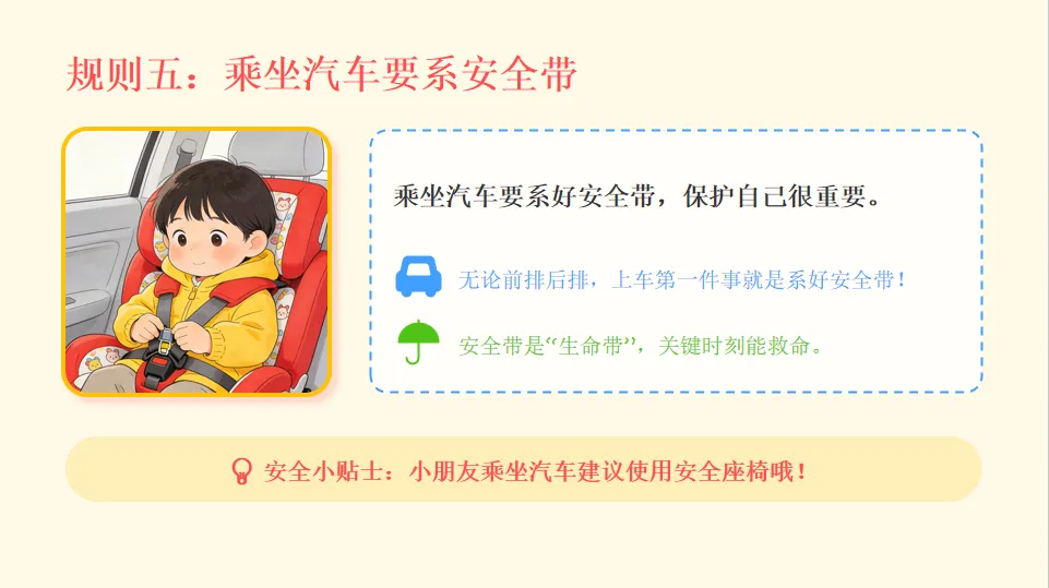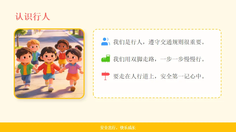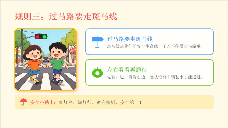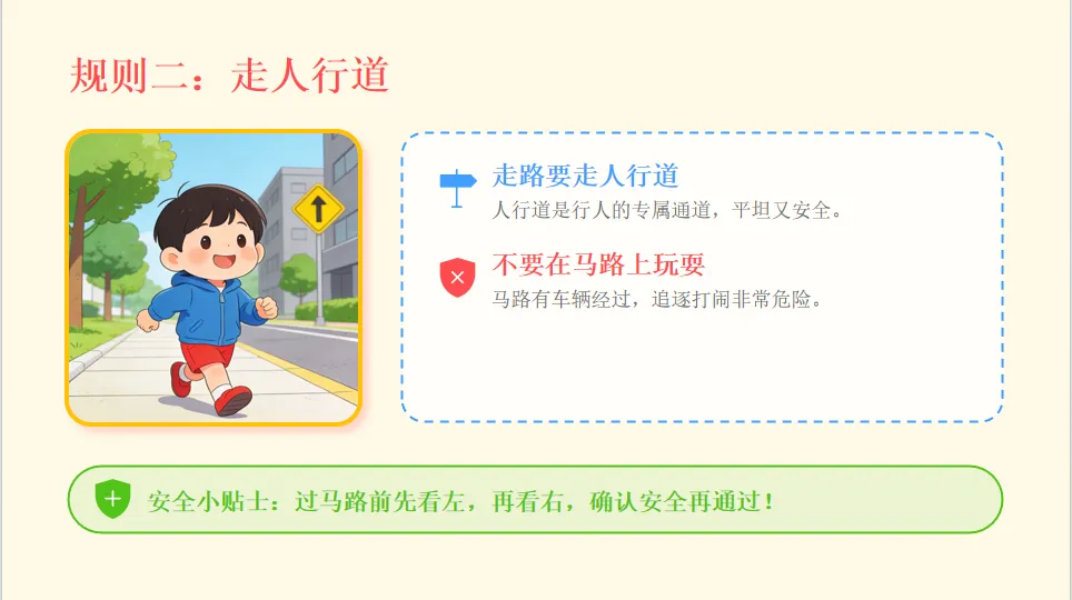 - 小结:不同交通工具都要遵守规则,行人要走专属道路。