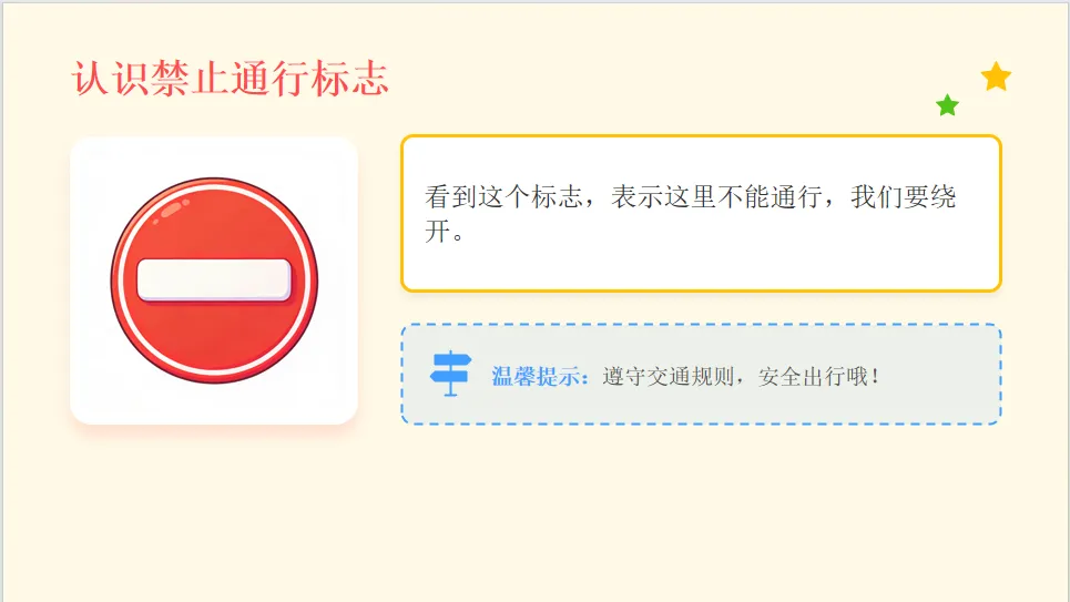 - 家园共育:请家长带幼儿观察路上的交通标志,一起文明出行。