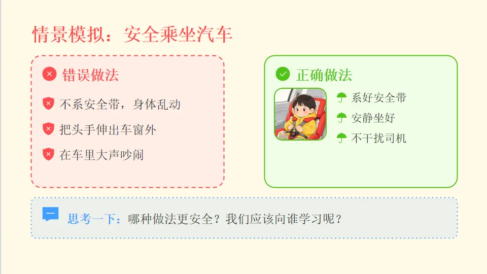 - 能力目标:能正确判断出行行为的对错,掌握过马路、乘车的安全方法。