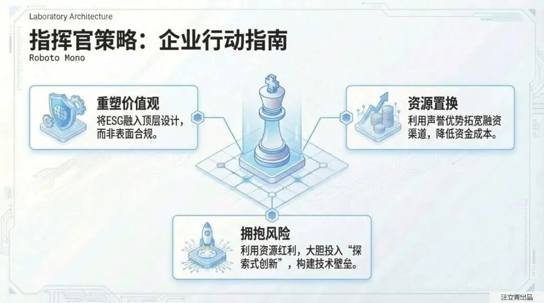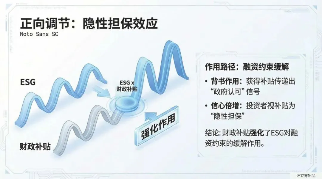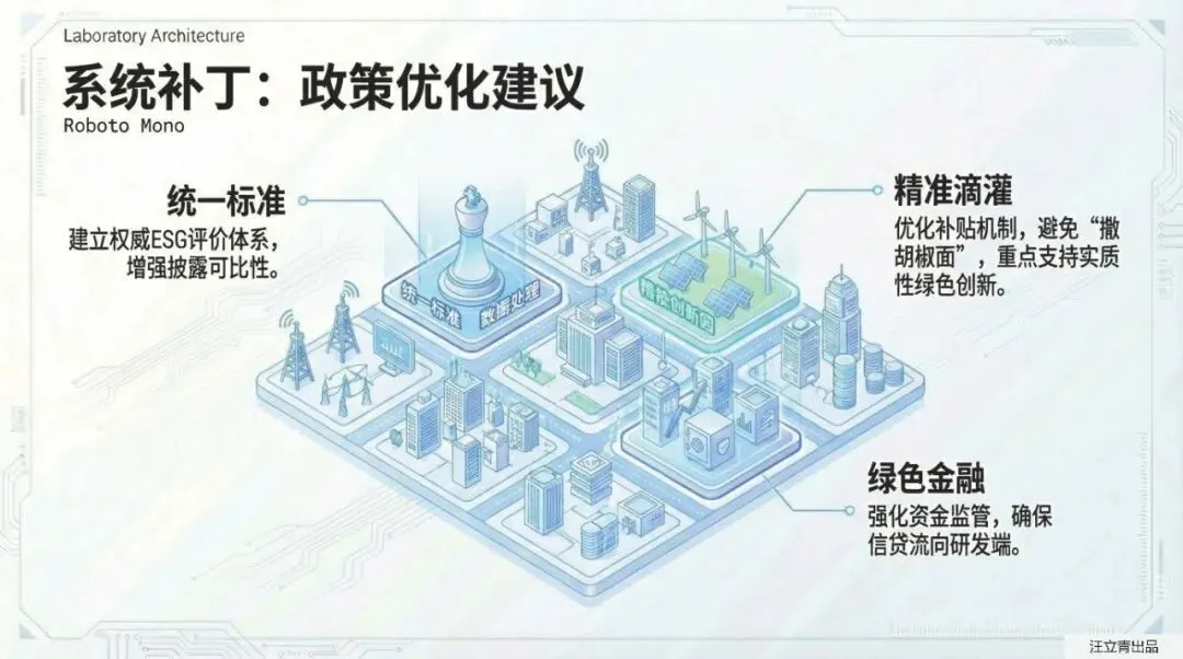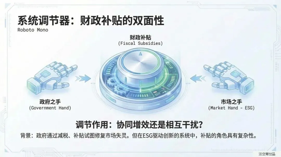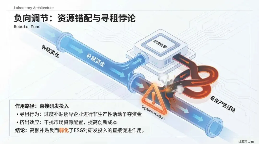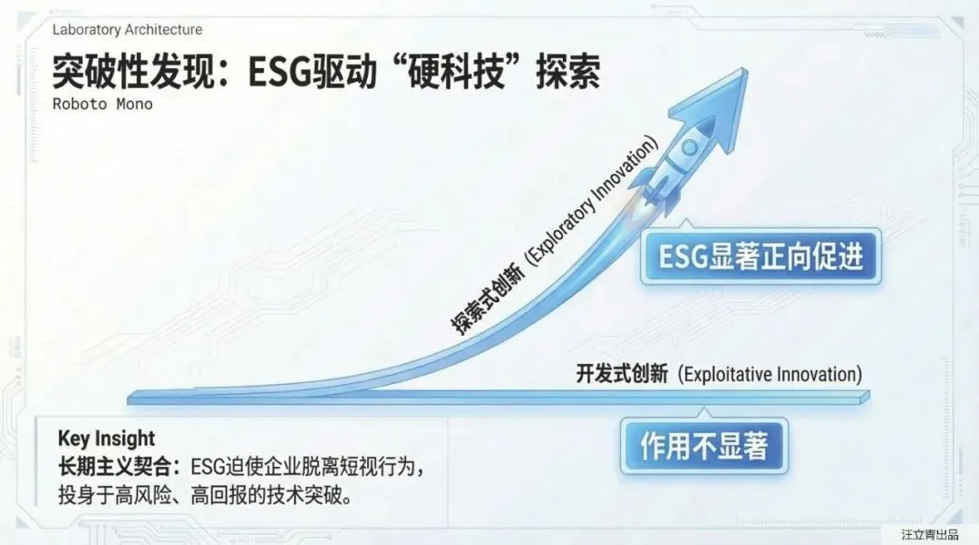 要做就做“颠覆性”创新! 这份报告最令人振奋的发现在于,ESG并非盲目推动所有类型的创新,而是精准指向了“探索式创新”(突破性创新)。数据显示,ESG表现对于那些旨在探索新技术、新知识的突破性创新具有显著促进作用,而对简单的模仿改良(开发式创新)影响不显著。此外,报告还发出了一个战略预警:虽然财政补贴能缓解融资压力,但在ESG促进研发的过程中,过度的补贴反而可能产生“挤出效应”或引发寻租行为,对ESG的创新驱动力产生负向调节,。因此,企业要想真正掌握核心技术,不能单靠等着拿补贴,必须主动打好ESG这张牌,利用市场机制倒逼自身实现从“跟随者”到“领跑者”的跨越。