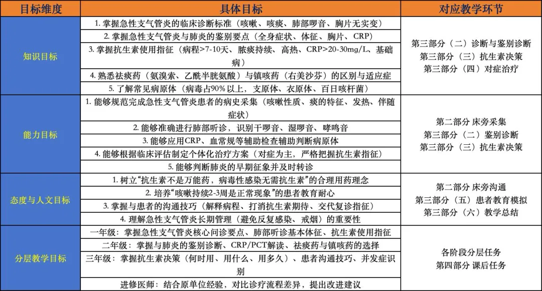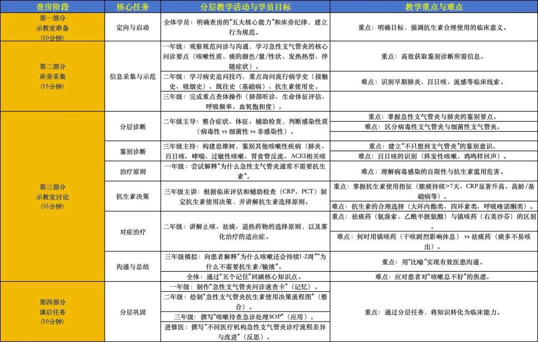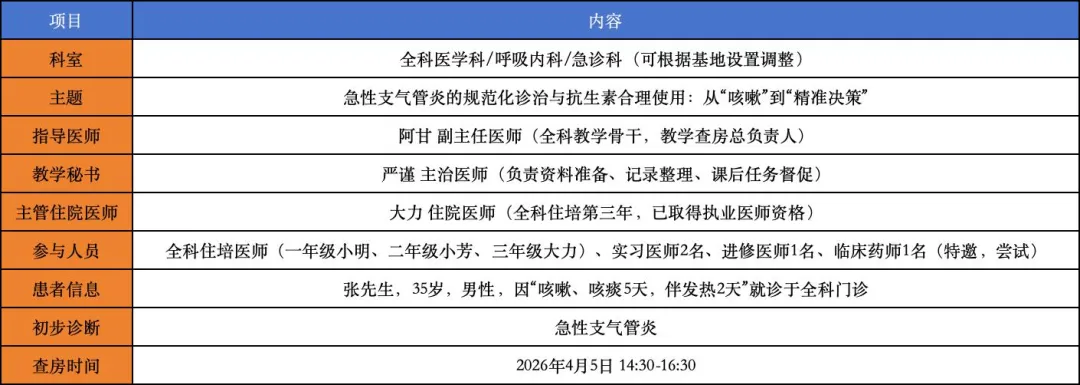 说明:本阶段仅做查房启动和注意事项说明。预习任务已前置完成,此处不再提问。场景:全科示教室。投影展示:呼吸道解剖图、急性支气管炎病理示意图、常见病原体列表、抗生素合理使用原则、对症药物一览表。“阿甘老师,各位学员,本次查房签到已完成。预习材料3天前已推送,学员书面作业已收齐汇总。”“各位同事,下午好。今天我们聚焦全科门诊又一个常见病——急性支气管炎。说它常见,因为咳嗽是门诊第一大主诉;说它容易误诊,因为它和肺炎、上感、百日咳有时难以区分。更重要的是,急性支气管炎的抗生素滥用问题非常突出——很多患者一来就要求‘消炎药’,而我们要做的,就是守好抗生素这道门。今天的病例很有教学价值:35岁男性,咳嗽咳痰5天,伴发热2天,来了就问‘医生给我开点头孢吧,快点好’。我们的任务是——通过规范问诊和查体,判断他是病毒还是细菌?需不需要抗生素?怎么止咳祛痰?怎么跟患者解释咳嗽还会持续一段时间?本次教学查房,我们围绕急性支气管炎诊疗的五大核心能力展开:1. 规范问诊能力:掌握急性支气管炎的问诊核心(咳嗽性质、痰的特征、发热、全身症状)2. 体格检查能力:准确评估肺部听诊、呼吸频率、血氧饱和度3. 鉴别诊断能力:区分急性支气管炎与肺炎、上感、百日咳等4. 抗生素决策能力:掌握严格的使用指征和药物选择5. 患者教育能力:用通俗语言解释‘为什么不需要抗生素’‘为什么咳嗽还会持续’重点询问咳嗽性质、痰的颜色和量、发热热型、有无呼吸困难避免在患者面前讨论‘可能发展成肺炎’等引起焦虑的词汇好,没有问题的话,我们5分钟后进入诊室。请大力医生准备汇报。”请大家讨论?????欢迎各位同仁提出您的建议和想法,指正不足。