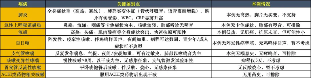 开始前:此步骤核心是问诊示范、重点查体、关键沟通,处处体现人文。时间有限,聚焦核心信息,不求面面俱到。指导医师全程观察学员操作,及时纠正易错点;指导医师做好床旁记录,重点记录学员操作亮点与不足。场景:全科门诊诊室。患者张先生坐在诊察椅上,偶有咳嗽,无陪同。责任护士(首先汇报,约1.5分钟):“阿甘老师,各位医师。患者张先生,35岁,男性,因‘咳嗽、咳痰5天,伴发热2天’来门诊就诊。来院时生命体征:T 37.8℃,P 84次/分,R 18次/分,BP 120/75mmHg,SpO2 97%。已建立门诊病历,采血结果待出。”主管医师(大力,脱稿汇报,约3分钟):“感谢护士老师。我汇报病史。患者张先生,35岁,公司职员,因‘咳嗽、咳痰5天,伴发热2天’就诊。现病史:5天前无明显诱因出现咳嗽,起初为干咳,2天后转为咳黄白色黏痰,量中等,易咳出。2天前出现发热,体温波动在37.5-38.2℃,无畏寒寒战。自服‘感冒药’(具体不详)效果不佳。发病以来,精神稍差,食欲减退,二便正常。无鼻塞流涕,无咽痛,无胸痛、呼吸困难,无咯血。既往史:既往体健,否认高血压、糖尿病、哮喘等慢性病史。否认吸烟饮酒。否认药物过敏史。入院查体:生命体征如上。神清,咽部轻度充血,扁桃体无肿大。双肺呼吸音粗,可闻及散在干啰音及少量湿啰音,以双下肺为著,无哮鸣音。心率84次/分,律齐。余查体未见异常。血常规:WBC 8.5×10⁹/L,N 65%,L 30%阿甘医师(对团队低语,教学点):(设计说明:床旁阶段指导医师不得进行教学点评,此处仅为教案记录。实际查房时,此部分内容移至第三阶段示教室。)“大家注意,大力的汇报抓住了几个关键:1.咳嗽病程5天,从干咳转为咳痰;2.痰为黄白色,中等量;3.低热2天,无寒战;4.肺部听诊有干湿啰音,但无实变体征;5.胸片仅纹理增粗,无肺炎表现。这些信息是后续鉴别诊断的基础。”阿甘医师:“张先生,你好。我是全科阿甘医生。你这次是支气管发炎了,肺部听诊有啰音,胸片也支持这个诊断。目前考虑病毒感染可能性大,因为血象不高,CRP轻度升高。我们会根据情况决定是否需要抗生素。咳嗽可能会持续一段时间,请你不要着急,我们会给你一个完整的治疗方案。”关于痰的性质:张先生,你咳的痰是黄色的,有没有变成脓痰(更稠、黄绿色)?每天大概咳几次?(评估细菌感染可能)关于伴随症状:有没有感觉气短、喘不上气?晚上咳嗽厉害吗?有没有影响睡眠?(评估严重程度及并发症)关于接触史:家里或单位有人感冒咳嗽吗?最近有没有接触过确诊流感的人?(评估流行病学)关于既往史:以前有没有哮喘、过敏性鼻炎?有没有胃病史(反流)?(评估慢性咳嗽可能)”阿甘医师:“大力,请你为患者进行一次重点查体。重点关注:①肺部听诊(干啰音、湿啰音的部位和性质);②呼吸频率和血氧;③有无呼吸窘迫体征(三凹征、鼻翼扇动)。”肺部听诊:双肺呼吸音粗,可闻及散在干啰音及少量湿啰音,以双下肺为著,无哮鸣音,无管状呼吸音床旁离场:“张先生,谢谢你的配合。我们会到示教室讨论你的情况,制定一个适合你的治疗方案。请稍等,我们很快回来跟你详细解释。”第三部分