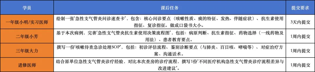 写在前面:本环节是临床思维训练的“重头戏”。学员可能卡壳或答偏,这正是指导师引导的价值。通过分层提问、情景模拟、递进追问,逐步构建完整的诊疗思维链。教学秘书做好讨论记录,重点记录学员发言要点、指导医师引导思路及核心教学知识点;指导医师遵循“学员主体、教师引导”的原则,避免“一言堂”,充分调动学员积极性。投影准备:患者血常规、CRP、胸片结果,急性支气管炎与肺炎鉴别表,抗生素使用指征表,对症药物一览表,患者教育话术模板。“首先回顾床旁阶段。大家表现整体规范,病史采集完整,查体到位。小明(一年级):你对肺部听诊很专注,能记住干啰音和湿啰音的区别(肯定)。如果下次能主动思考一下‘为什么病毒感染也会有湿啰音’,就更好了——因为病毒感染会引起气道炎症、分泌物增多,出现痰鸣音(湿啰音)(改进建议)。你的听诊基础不错,继续加强(再次肯定)。小芳(二年级):病史追问很完整,特别是痰的性质、伴随症状、接触史(肯定)。接下来我们要练习如何把这些信息和化验结果‘串联’起来,判断是否需要抗生素(改进建议)。你的临床思维很好,继续保持(再次肯定)。大力(三年级):床旁汇报重点突出,查体规范,特别是注意到了肺部啰音的部位和性质(肯定)。接下来我们要把抗生素决策和对症治疗理清楚,同时学会如何向患者解释咳嗽的病程(改进建议)。你的综合能力已经很出色,继续保持(再次肯定)。”“好,现在回到示教室。首先请二年级小芳,根据现有资料,明确诊断,并与其他疾病鉴别。”“好的。根据病史、查体及辅助检查,患者符合急性支气管炎的诊断。“本例诊断明确,但需注意,部分肺炎早期胸片可阴性,如果患者症状加重(高热、呼吸困难)或治疗无效,应复查胸片。”“好,诊断明确了,现在进入核心环节——这个患者需不需要抗生素?请大力根据指南讲解。”急性支气管炎90%以上由病毒引起,常见病毒包括:流感病毒、副流感病毒、呼吸道合胞病毒、腺病毒、鼻病毒、冠状病毒等。细菌感染仅占少数(<10%),常见细菌包括:肺炎支原体、肺炎衣原体、百日咳杆菌、肺炎链球菌等。根据《中国成人急性呼吸道感染抗生素合理使用指南》,急性支气管炎抗生素使用需严格掌握指征:对于少数需要抗生素的病例(如确诊支原体/衣原体、百日咳),药物选择如下:注意:我国肺炎支原体对大环内酯类耐药率高,有条件可考虑多西环素或呼吸喹诺酮类。CRP和PCT的价值:CRP>20-30mg/L提示细菌感染可能,PCT>0.25μg/L也有参考价值;本例CRP仅12,支持病毒感染。抗生素滥用风险:抗生素不能缩短病毒性支气管炎的病程,反而可能导致肠道菌群紊乱、过敏、耐药。“好,既然不用抗生素,那怎么治?请二年级小芳讲解对症治疗药物的选择。”常用药物:布地奈德(抗炎)、沙丁胺醇/异丙托溴铵(解痉)、氨溴索/乙酰半胱氨酸(祛痰)本例无喘息,可不用解痉药,如咳嗽剧烈可考虑布地奈德雾化。5. 其他:充足饮水、休息、保持空气湿润,有助于缓解症状。“很好!对症治疗做对了,患者就能平稳度过。那追问一句:什么情况下需要复诊或转诊?”“最后一个环节——沟通。请大力医师模拟向患者解释:为什么不需要抗生素?为什么咳嗽还会持续?”第一,为什么不需要抗生素?您这次的支气管炎,从血象和症状看,是病毒感染的可能性大。病毒感染就像一场感冒,是自限性的,靠我们自己的免疫力就能好,一般需要1-2周。抗生素是杀细菌的,对病毒没用,用了反而可能引起肠道不适、耐药,得不偿失。第二,为什么还要咳一段时间?即使病毒感染好了,气道的炎症和损伤修复需要时间,咳嗽可能会持续2-3周,这是正常现象。就像皮肤擦伤,伤口长好了,但局部还会不舒服几天。所以您不要着急,只要咳嗽在慢慢减轻,就没问题。第三,我们怎么治?给您开了祛痰药,帮助把痰咳出来,这样气道干净了,咳嗽也会好转。如果发烧,可以吃退烧药。多喝水、多休息。第四,什么时候需要回来?如果出现高烧不退、气短、咳脓痰增多,或者咳嗽超过3周还没好,随时回来复诊。您还有什么问题吗?”“大力的沟通做到了四点:①用比喻(皮肤擦伤)解释咳嗽持续的原因;②解释为什么不用抗生素;③交代了治疗方案;④明确了复诊指征。非常好。”“今日路径回顾:咳嗽咳痰 → 问诊+查体+胸片+CRP → 诊断急性支气管炎 → 鉴别排除肺炎等 → 决定对症治疗(无抗生素指征) → 选择祛痰药 → 患者教育。急性支气管炎的管理,核心是避免抗生素滥用、做好对症支持、耐心解释病程。我们的任务就是:严格把握抗生素门槛,用对药,说对话。记住鉴别:必须排除肺炎(高热、实变体征、胸片浸润)记住指征:抗生素仅用于少数情况(持续>7-10天、脓痰、高热、CRP显著升高、基础病)记住教育:病程2-3周,咳嗽会持续,抗生素无效,需按时复诊(教学秘书完善查房记录,统计学员预习及课后任务完成情况,整理教学效果反馈,提交给指导医师或教学主任,形成教学闭环。同时,将本次查房的核心知识点、病例讨论要点整理,分享给科室全体住培学员,供后续学习参考。)