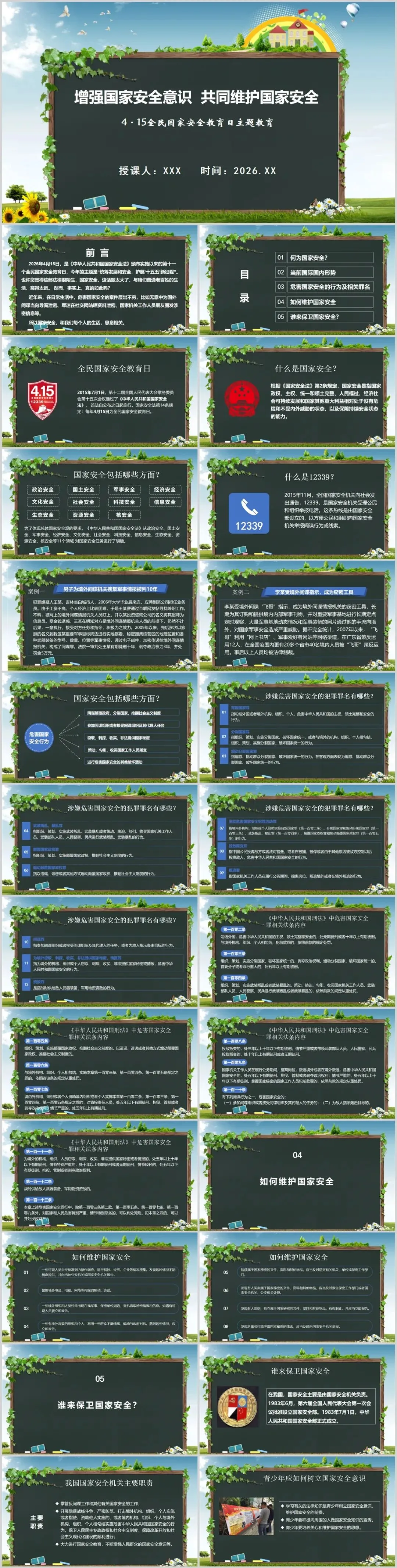 实现中华民族伟大复兴的中国梦,前提和基础是维护国家安全。离开安全,发展无从谈起。本期课件从国家安全的基础知识入手,帮助大家树立国家安全意识,深入践行总体国家安全观,凝聚起维护国家安全的强大全民合力。因篇幅有限,仅展示部分内容。